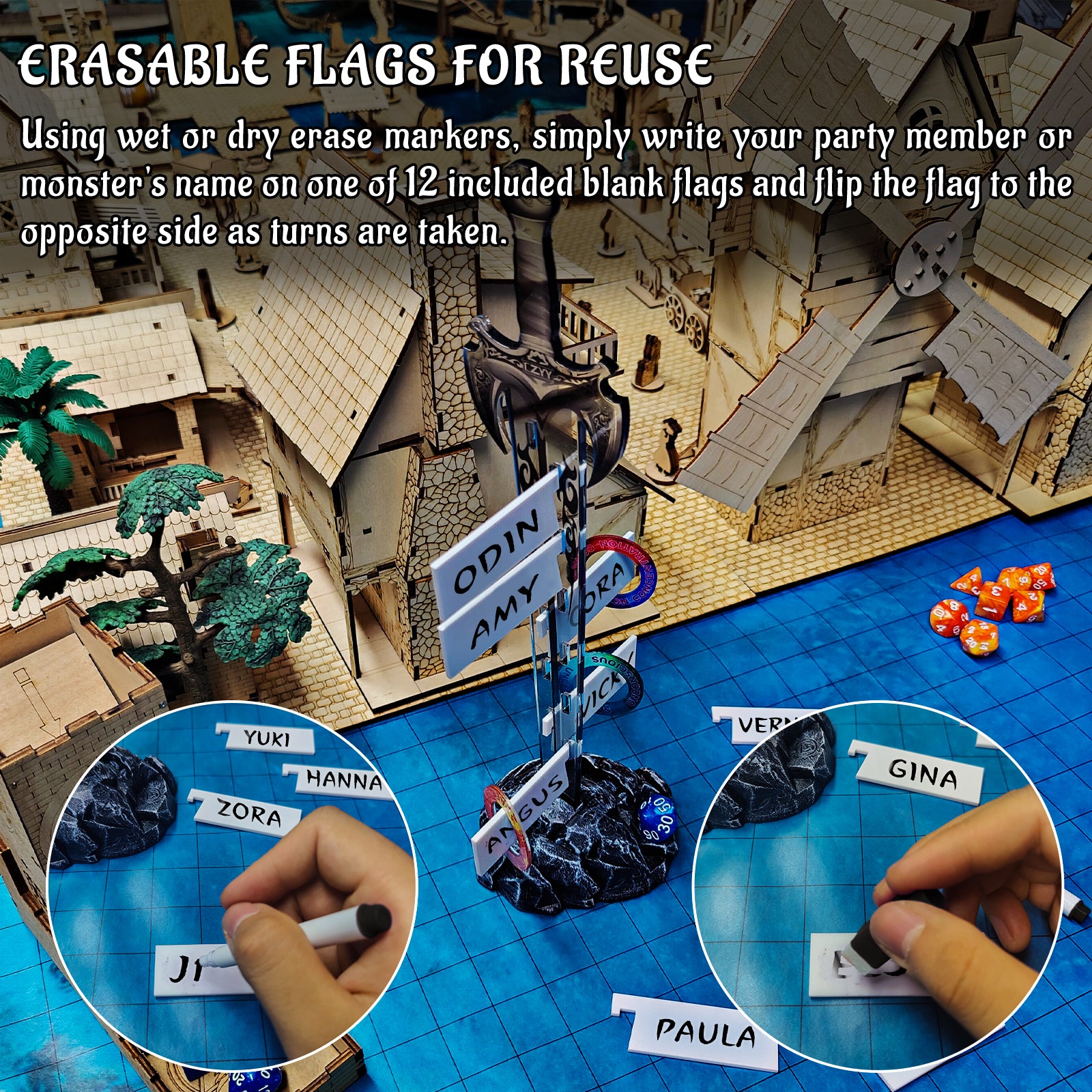 - BANDERAS BORRABLES PARA REUTILIZAR: usando marcadores de borrado húmedo o seco, simplemente escriba el nombre del miembro de su grupo o del monstruo en una de las 12 banderas en blanco incluidas y gire la bandera hacia el lado opuesto a medida que se toman los turnos.