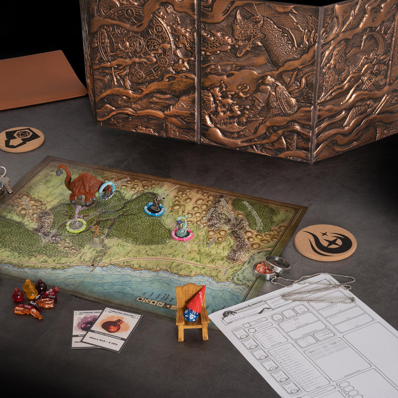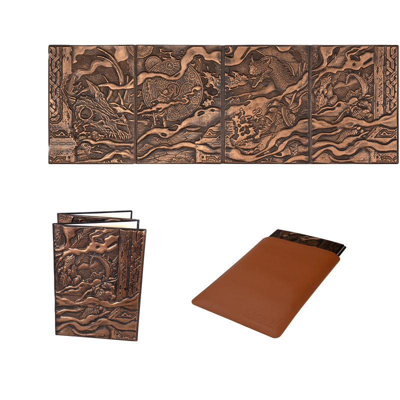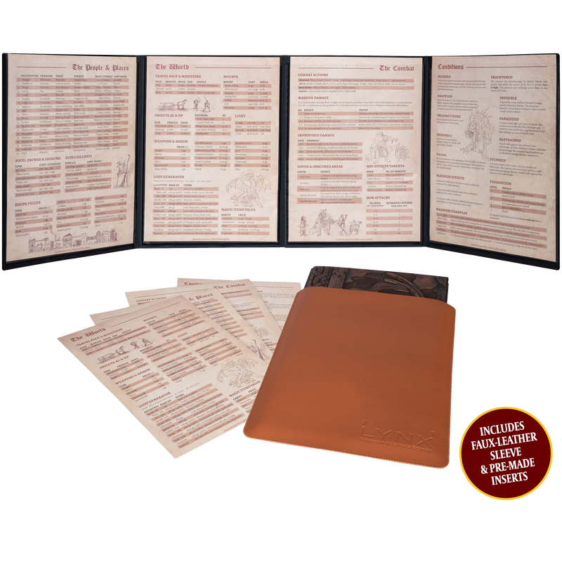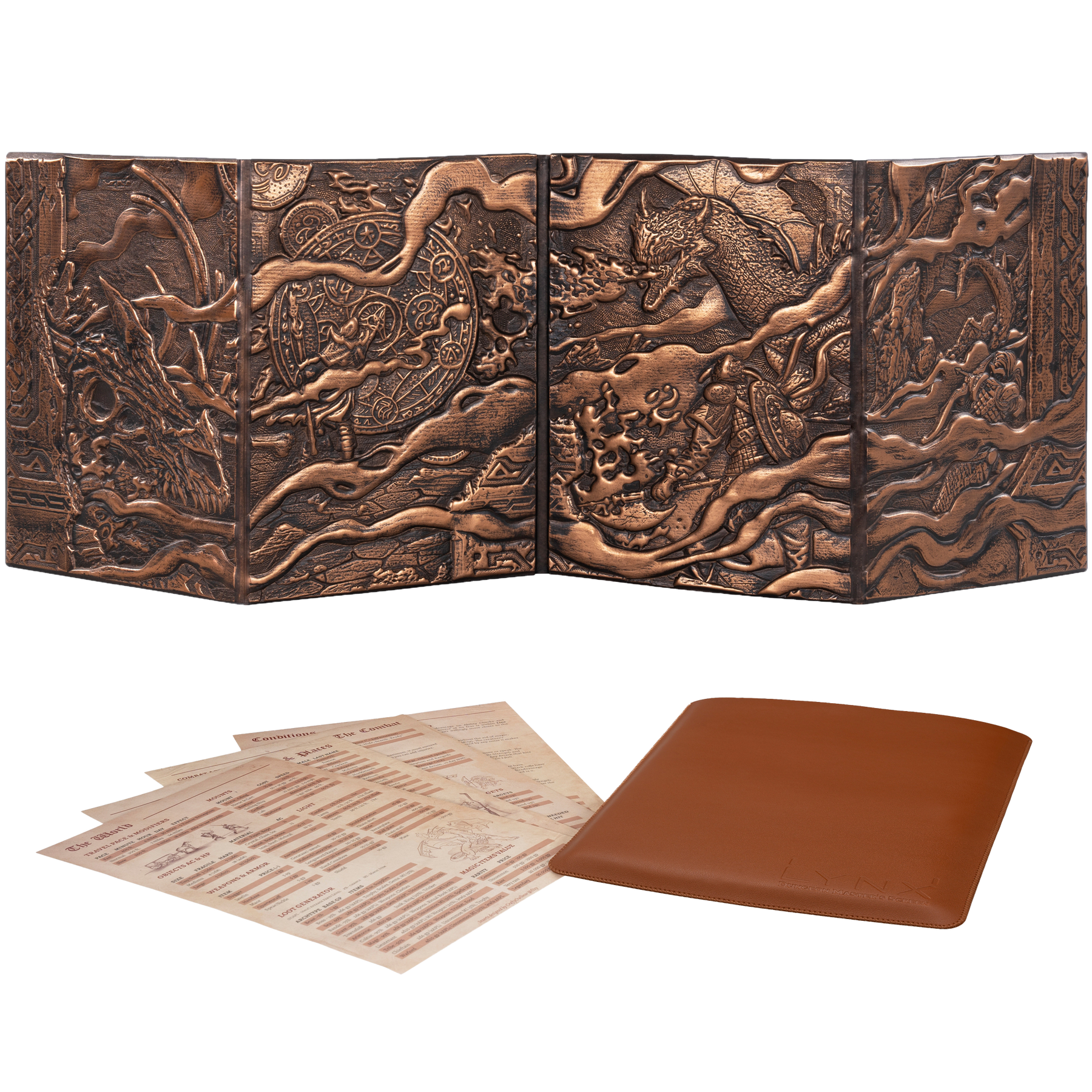 Ontdek ons opmerkelijke handgemaakte Dungeon Master Screen van kunstleer, met een verbluffend 3D-gevechtsscène. Het wordt geleverd met een kunstleren draagtas en verwisselbare, vooraf gemaakte inzetstukken. Met een afmeting van 36 inch breed en 12 inch hoog (91,5 cm x 30,5 cm) voegt dit scherm zowel stijl als functionaliteit toe aan uw gamesessies.
